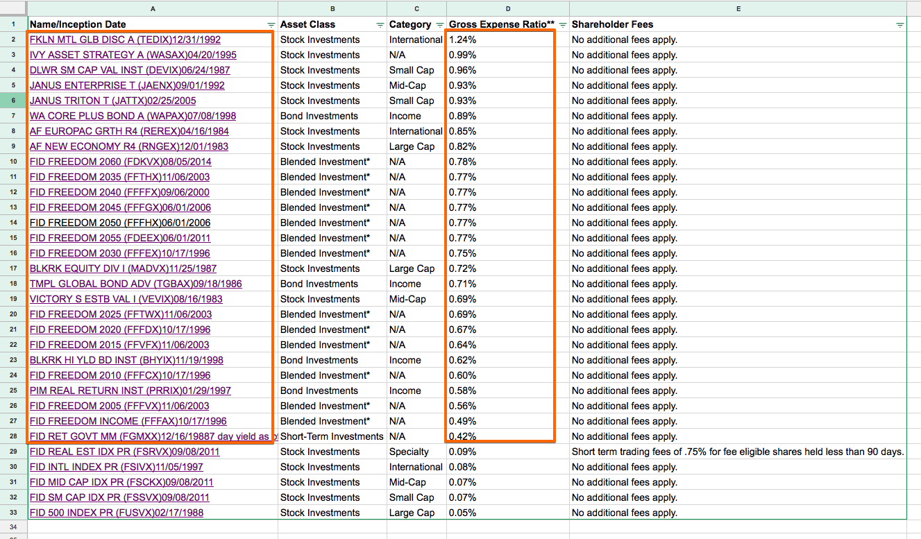 Choices offered by my 401(k) provider (Fidelity) sorted in descending order of expense ratios (i.e. fees). Look to invest in the low-cost index funds towards the bottom of the list.